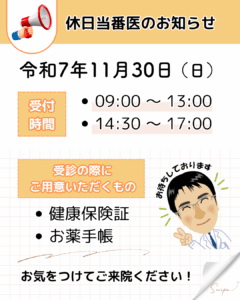 令和7年11月30日(日)は、久留米市の休日当番医として診療を行います。